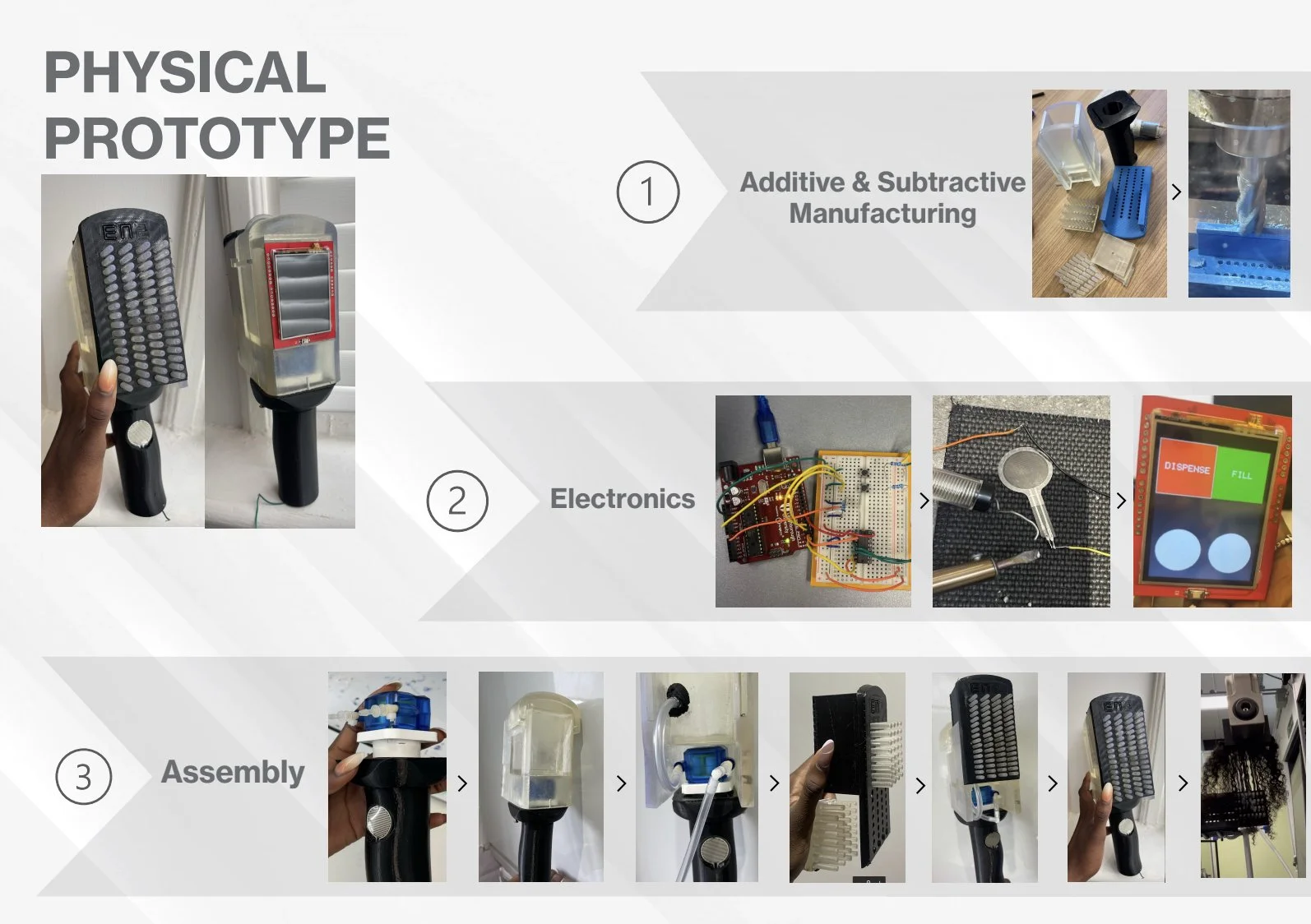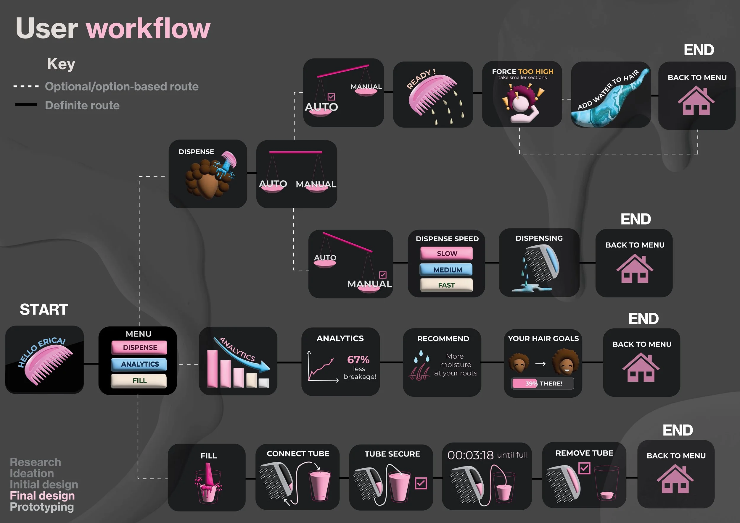 The product ideation stage served as a development stage for the original concept of a ‘cream dispensing comb’. Multiple aspects were explored in relation to intelligent features and additional capabilities, that were grouped by consumer needs that arose in the questionnaire phase.