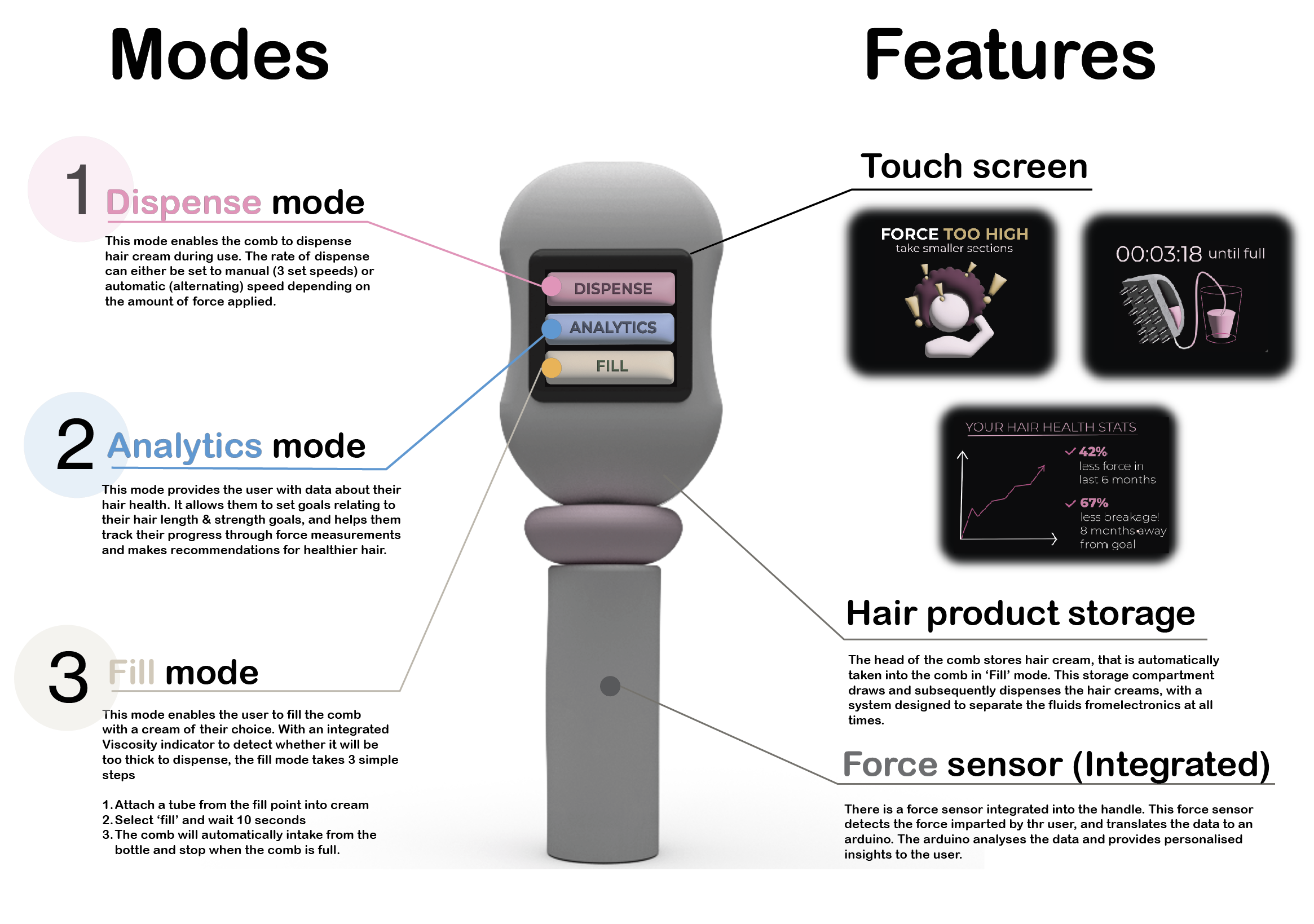 SMARTFro is an intelligent comb that monitors the combing force to dispense a corresponding amount of hair cream, and provides hair health tracking data to reduce breakage once & for all.